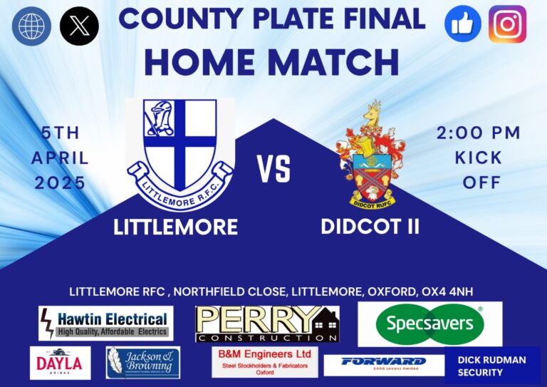 Littlemore XV are through to the finial in the Plate completion. Its been a while since we can say such a thing so come along and watch the match.